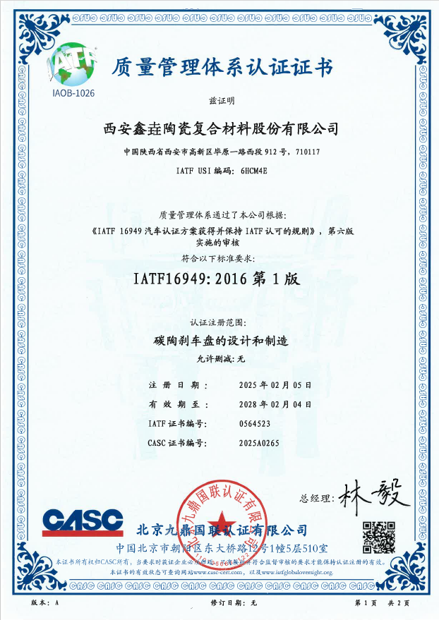 近日,西安鑫垚陶瓷復(fù)合材料股份有限公司收到了北京九鼎國聯(lián)認(rèn)證有限公司下發(fā)的IATF 16949汽車質(zhì)量管理體系認(rèn)證證書,認(rèn)證注冊范圍為“碳陶...